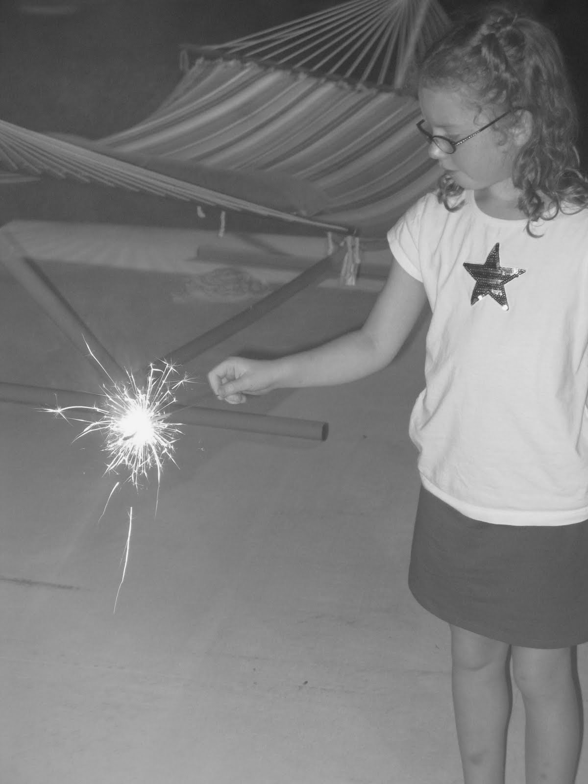 Yesterday was the 4th of July, so fireworks were required. Problem being, they are illegal everywhere around here. So after we had grilled steaks and burgers uncle Bob and I dragged the kids all over god's creation to find fireworks. I think Bob deserves a medal for doing these things :) we finally found some in a questionable neighborhood, after escaping our possible carjacking we made it home. To find the place where fireworks were to be popped, was empty. neither of us felt up to going to the pokey, so we just got in the car and came home. We had fun with the sparklers and smoke bombs, which stink by the way :) Midget was all about the sparklers, but had a love hate relationship. She is all about sparkly things, but all against feeling the occasional spark. Monkey, well he is all about blowing stuff up. He was putting little fireworks in bottles of water and blowing them up. This sends the bottle up in the air, and that is apparently the most awesome thing in the world. After i am sure cps won't take him away for it, i will put his super cool video on here :)